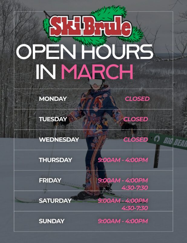 - Lift Operation: 9-4:00 Thursday through Sunday in January, February, March & 1/19, 2/16, 4/2-4/5 & thereafter Saturday & Sunday in April.