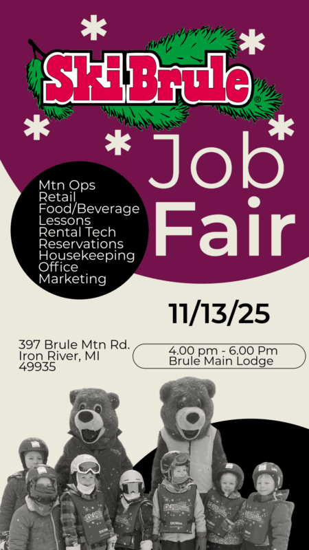 Ski Brule is hiring motivated, outgoing individuals to join the team. Experience preferred but will train the right applicant. Full time & part time positions available. Friendly, helpful and hospitable attitudes necessary. Weekend and holiday work required.