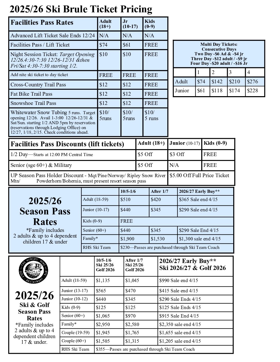 | BBQ will be at the Brule Lodge on 11/29, 12/6. (12/13 tentatively at HS Lodge) Homestead Lodge will be on Saturdays (pending target opening of the Homestead Lodge) and 12/28, 12/30. Starting every Saturday 1/2 through season. 5-8:00pm. | |||